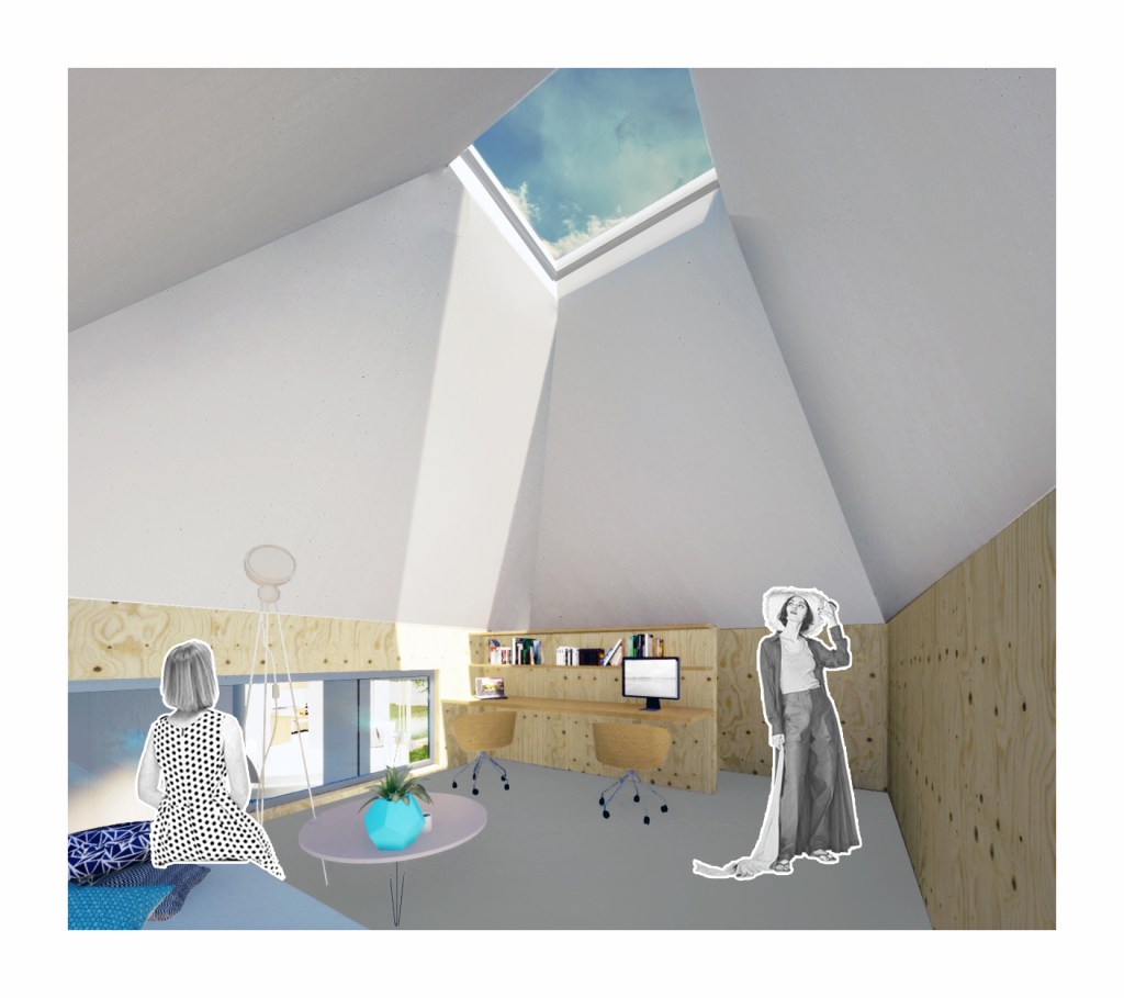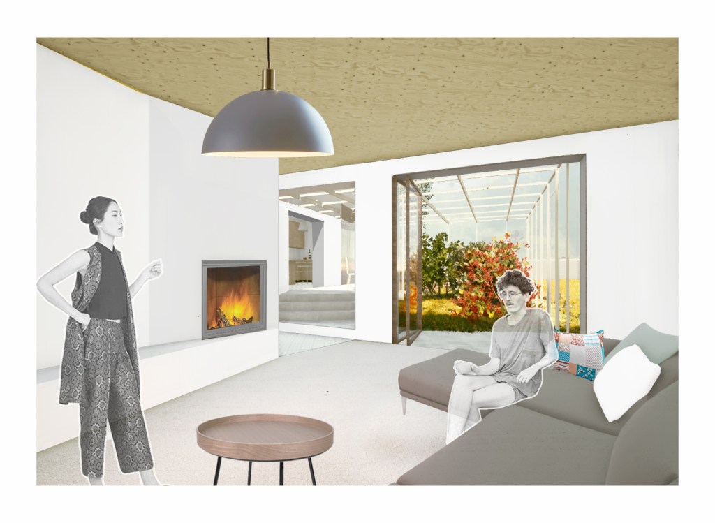 Deschiderea spre nucleul casei, zona de zi, este amplificată de înălțimi ale spațiilor pe două niveluri. Legătura vizuală cu zona de noapte sau cu spațiul de studiu, întărește această caracteristică. Sera filtrează relația cu exteriorul, umple camera de zi cu lumină și crește intimitatea. Dar cel mai important, găzduiește colecția de plante exotice. Sauna contribuie la atmosfera relaxată.