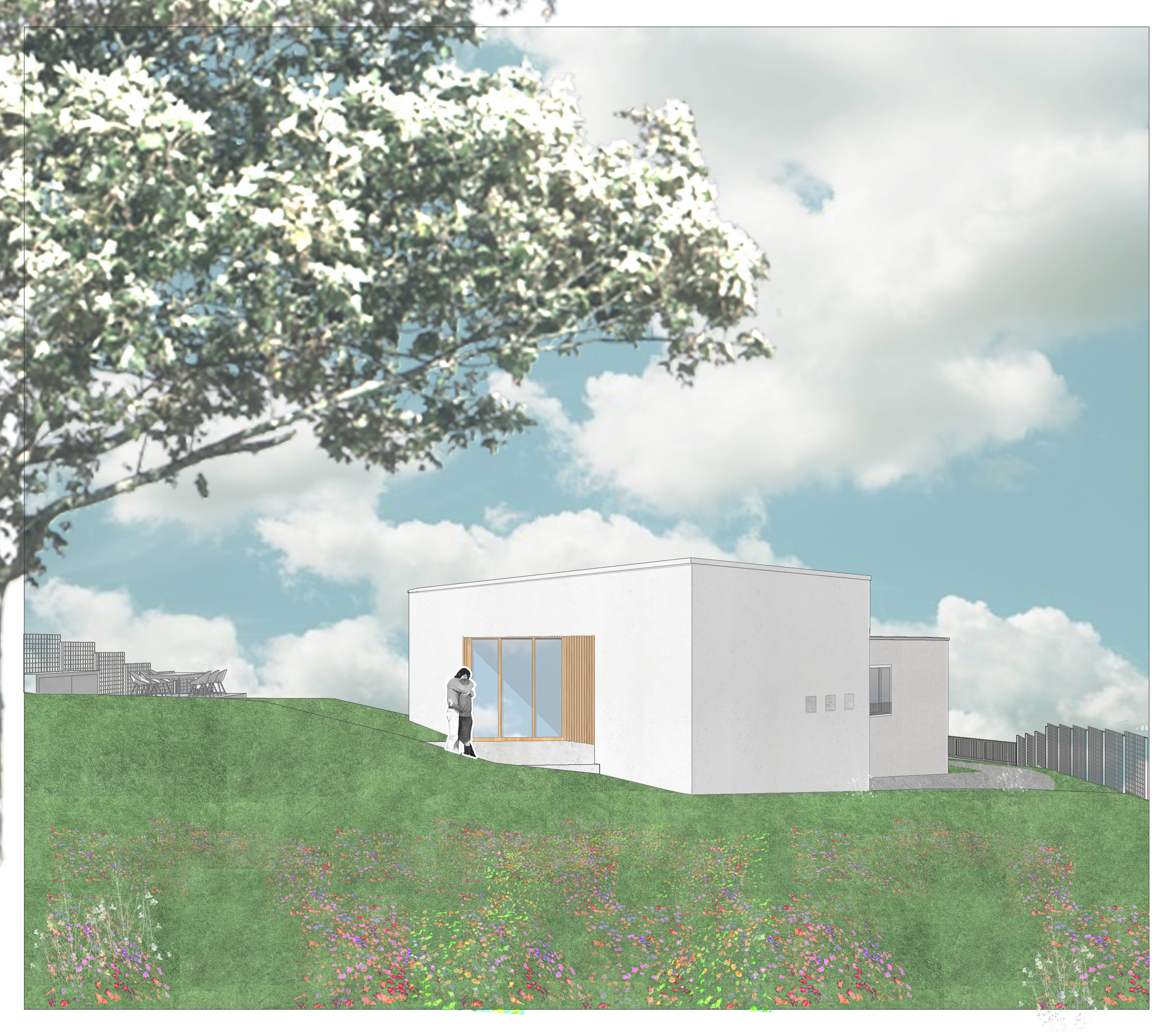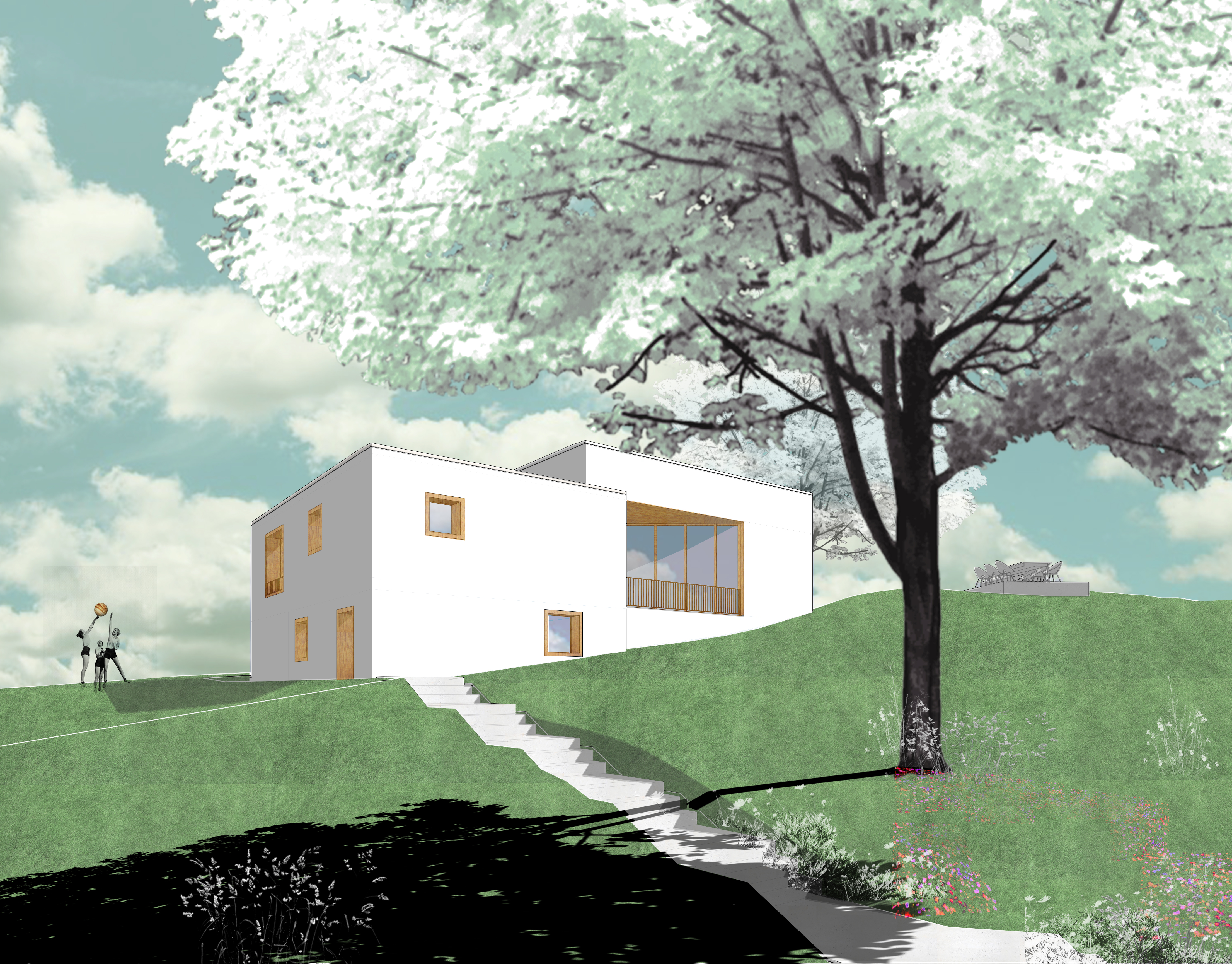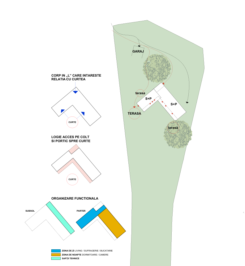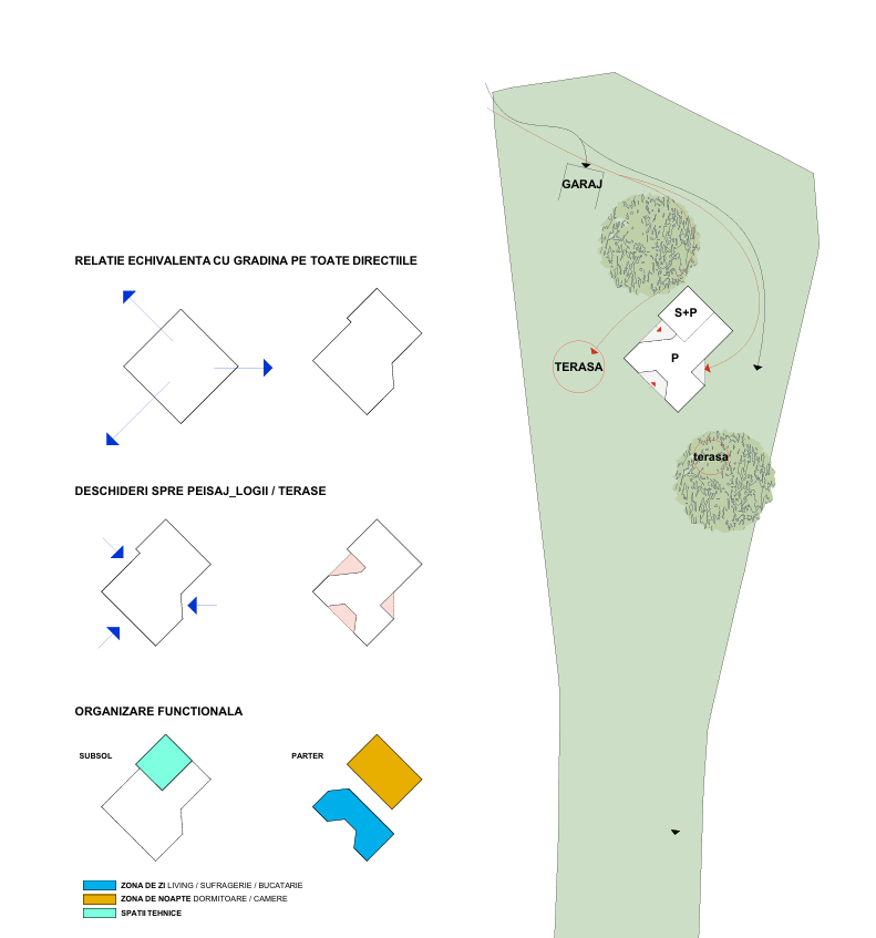 Locația parcelei într-o zonă atipică (pavilionară) din sat, prin învecinarea cu o biserică mică și clădirea școlii, am putut merge spre un mod de ocupare a terenului insular, între doi nuci maturi care domină situl. Opurtunitatea care a apărut în acest caz este relația cu exteriorul care se poate realiza în toate direcțiile și din toate spații importante ale casei.