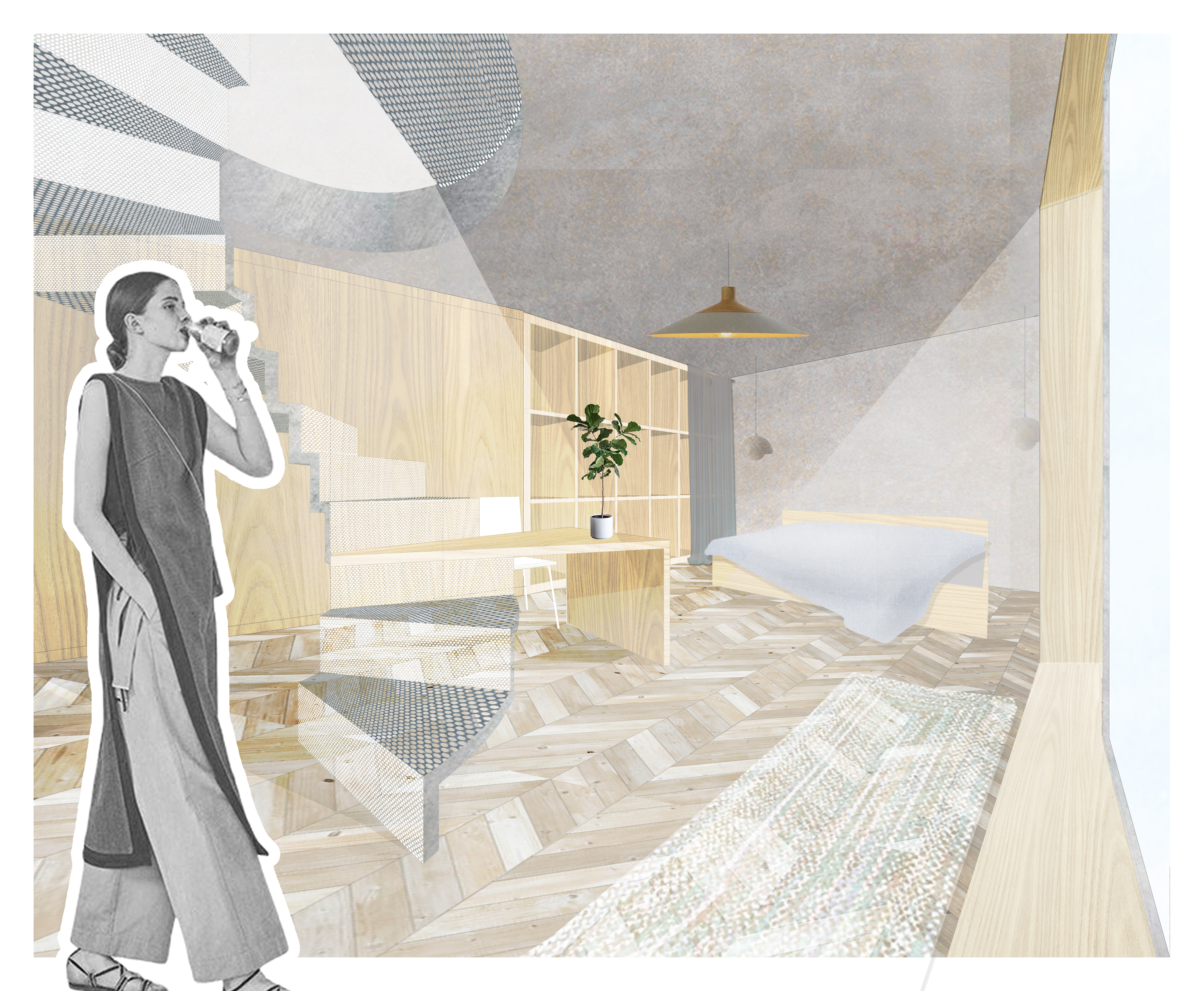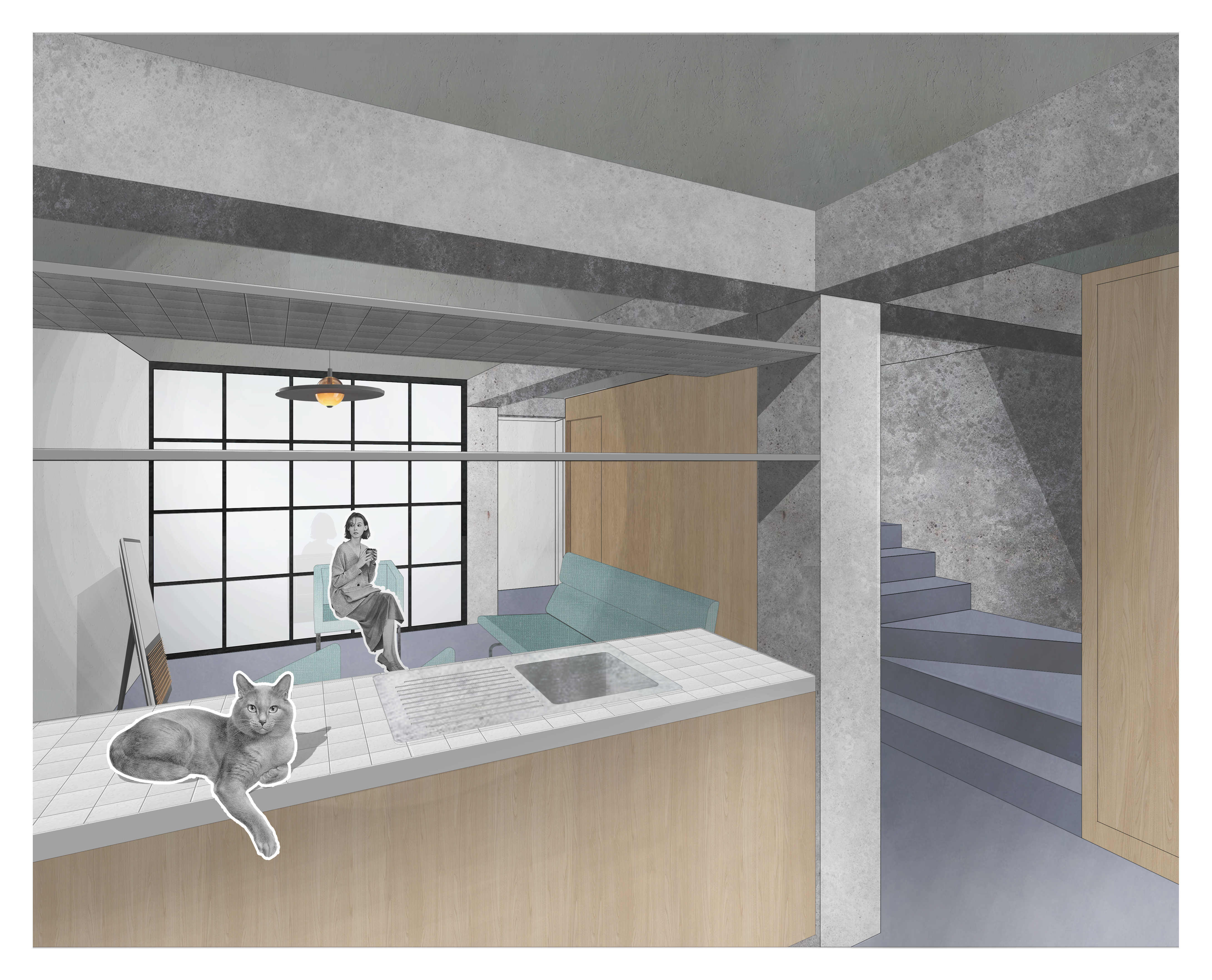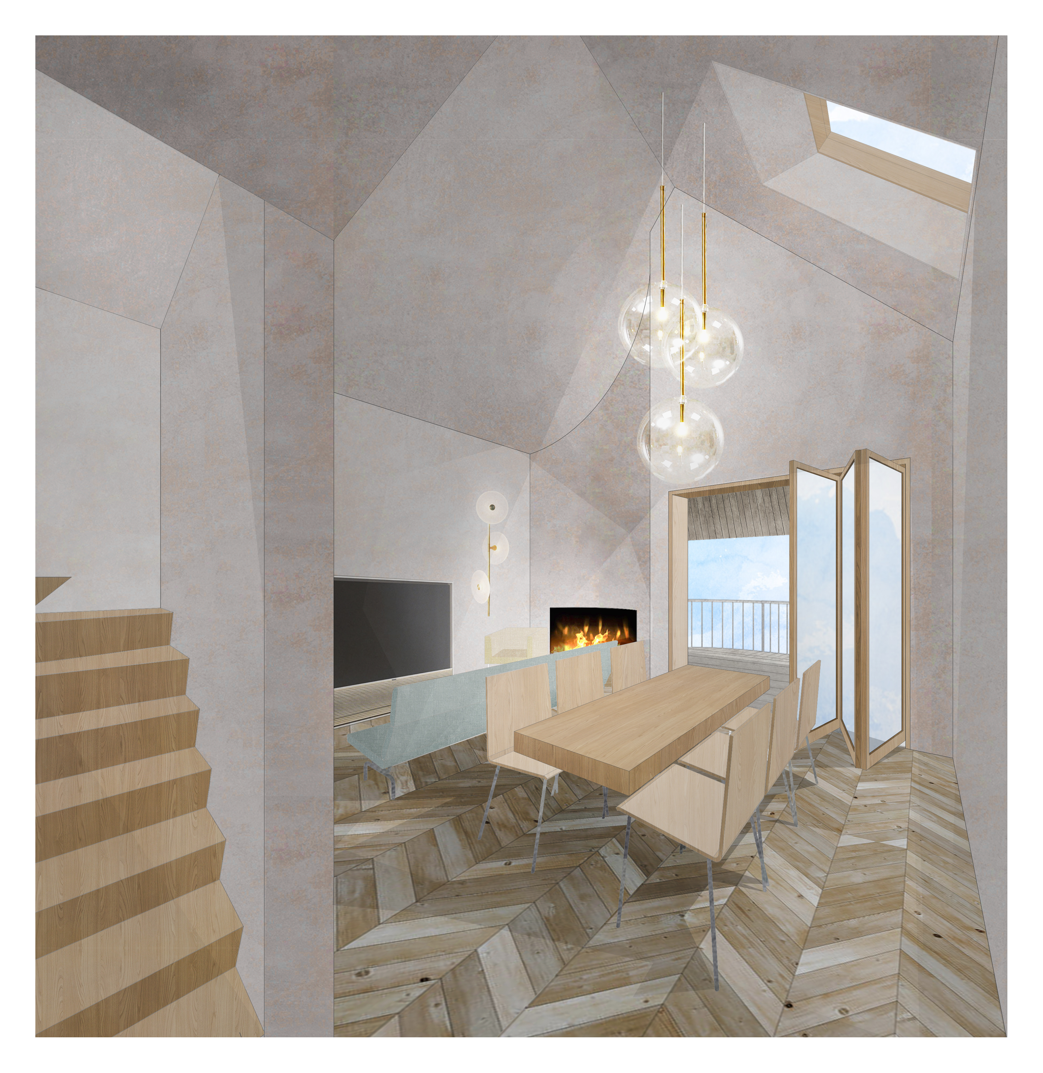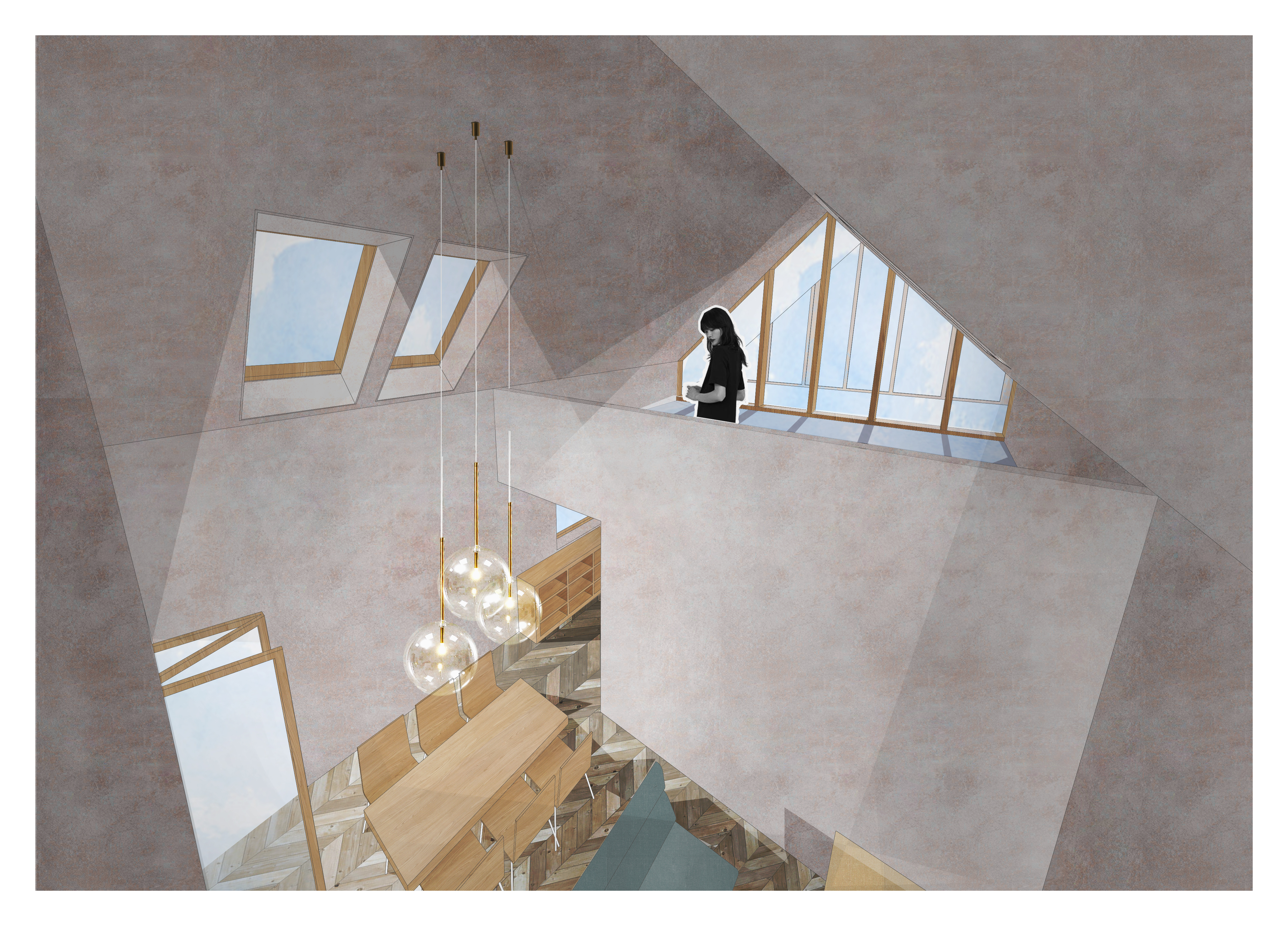 Casa de scară existentă am prelungito astfel toate cele 3 niveluri sunt legate vertical. CHiar și așa, demisolul are și acces separat și poate funcționa independet de parter. Mansarda este ocupată de un spațiu cu flexibil, deschis spre living ca o supantă și cu un vitraj în planul învelitorii care aduce lumină în miezul casei. Acest gest este influențat de lățimea redusă a parcelei care nu lasă loc mult de perspective și reduce relația cu exteriorul din cauza vecinătății apropiate a clădirilor stânga / dreapta. Din acest motiv am ales opțiunea de acreea decupaje pentru a avea o relație mai intimă cu exteriorul, sub forma unor logii.