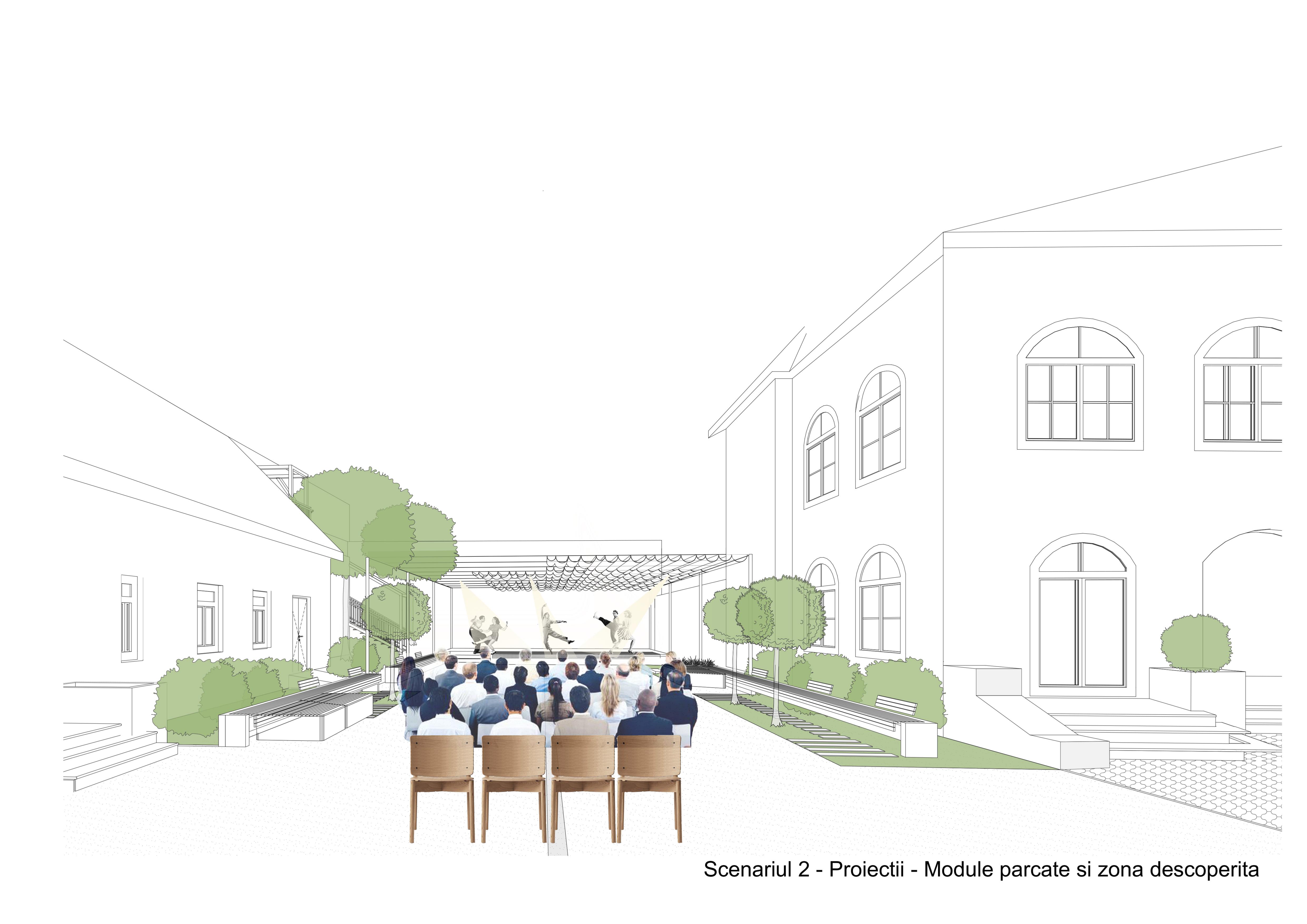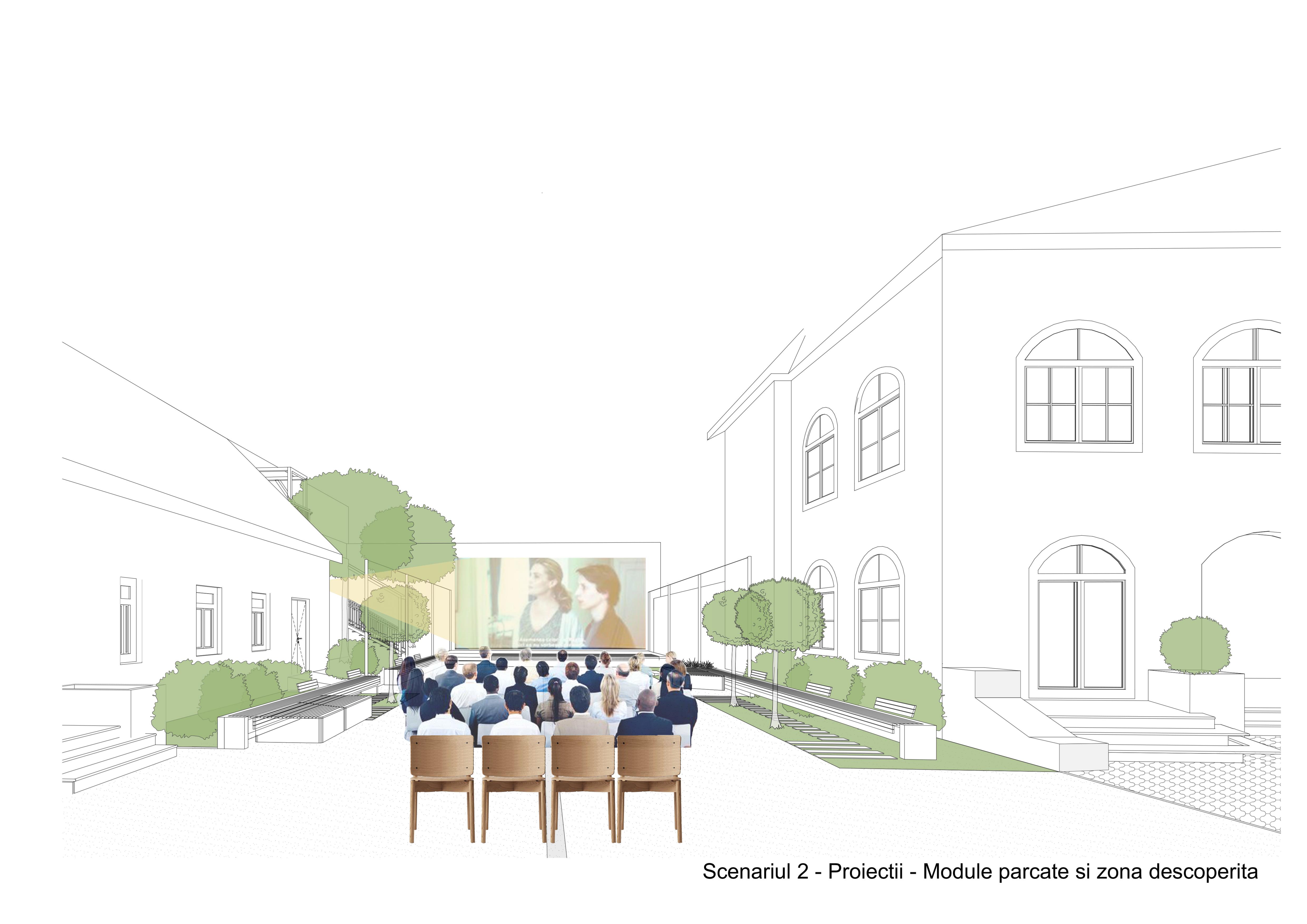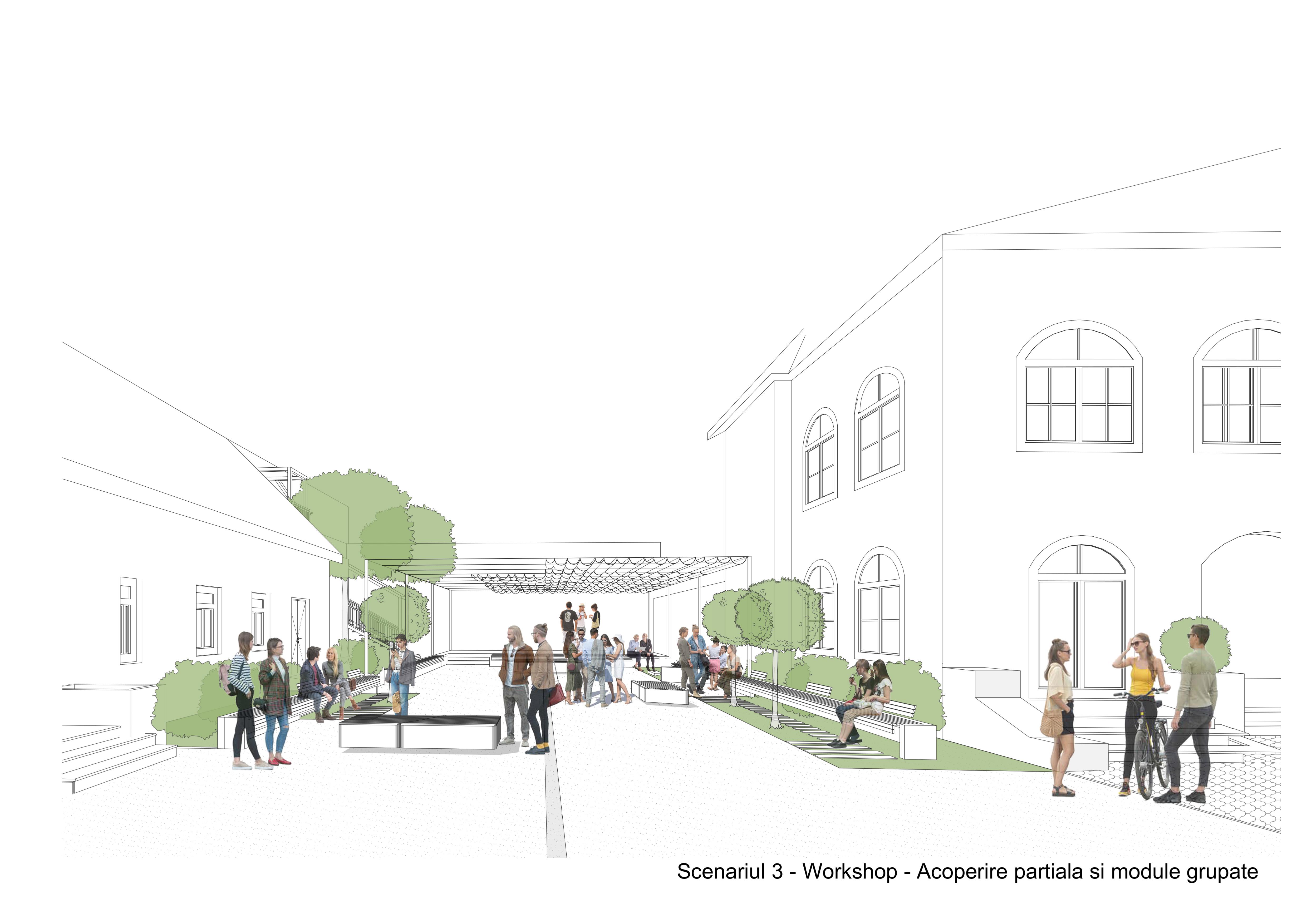 Am mers pe o soluție care ajută cât mai mult polivalența aceswtui spațiu ca design. Am conturat o curte cât mai liberă, dreptunghiulară, cu banci fixe și mobile pe contur și o zonă mai înailtă cu rol de scenă. Flexibilitatea utilizării curții e dată de modulele mobile, corpuri de bănci pe roți și de o copertina de pânză retractabilă care are rol de protecție de soare.