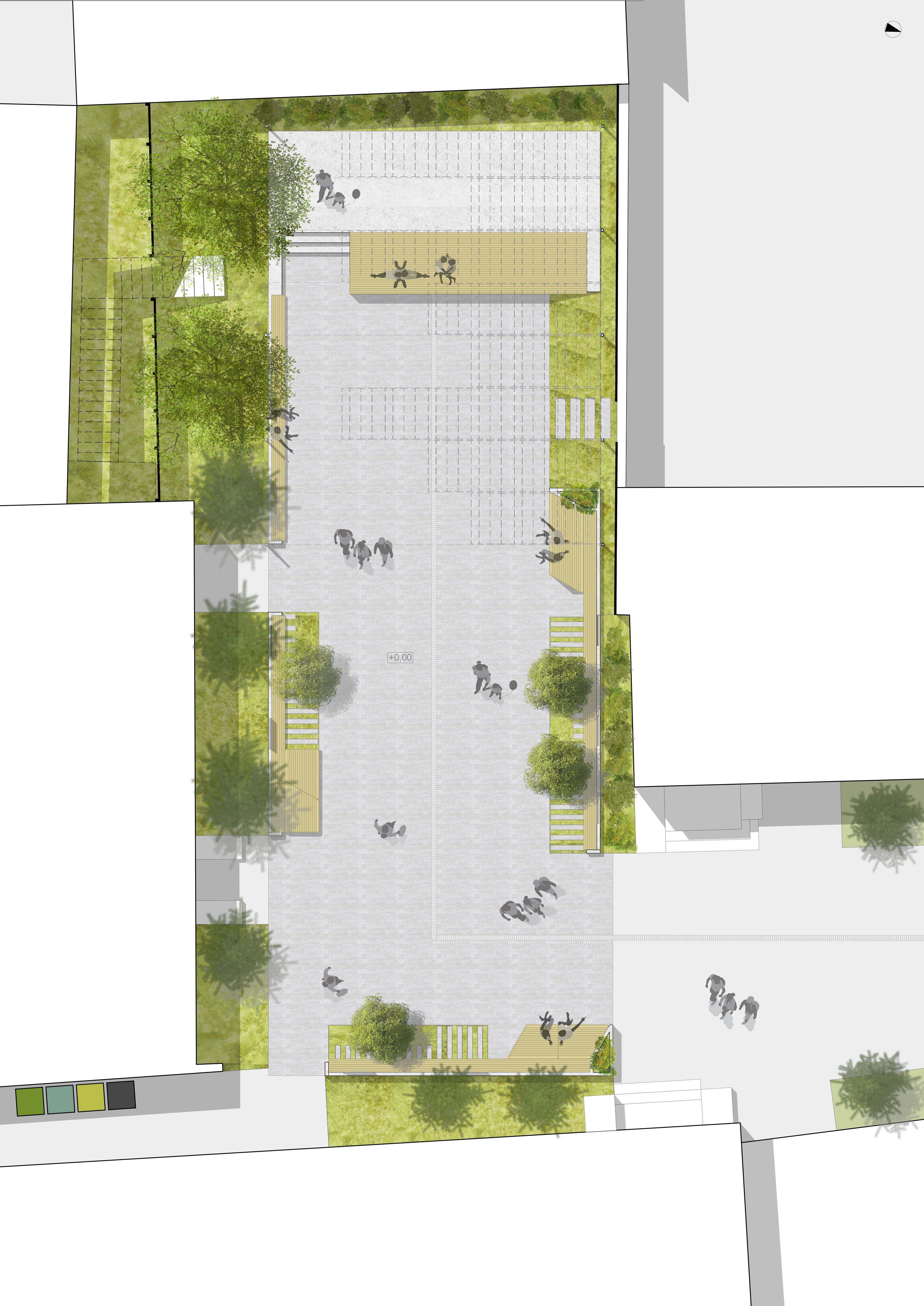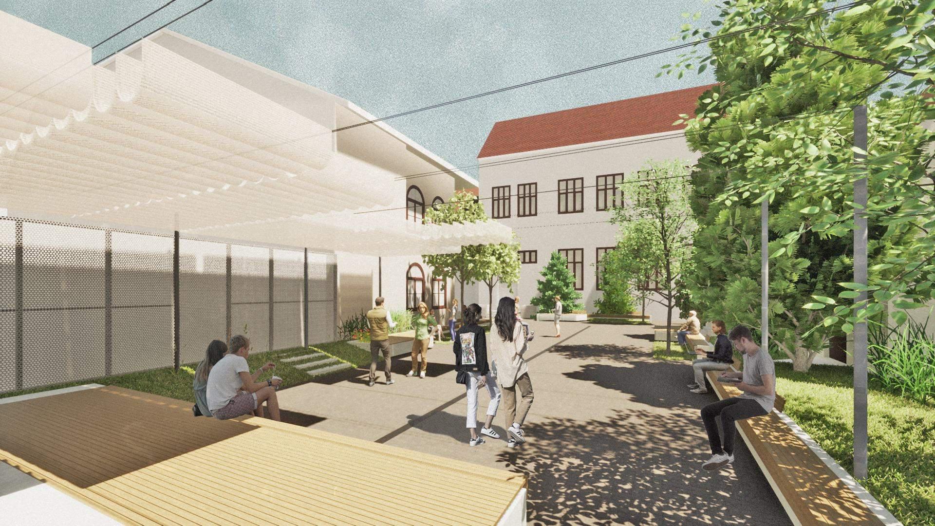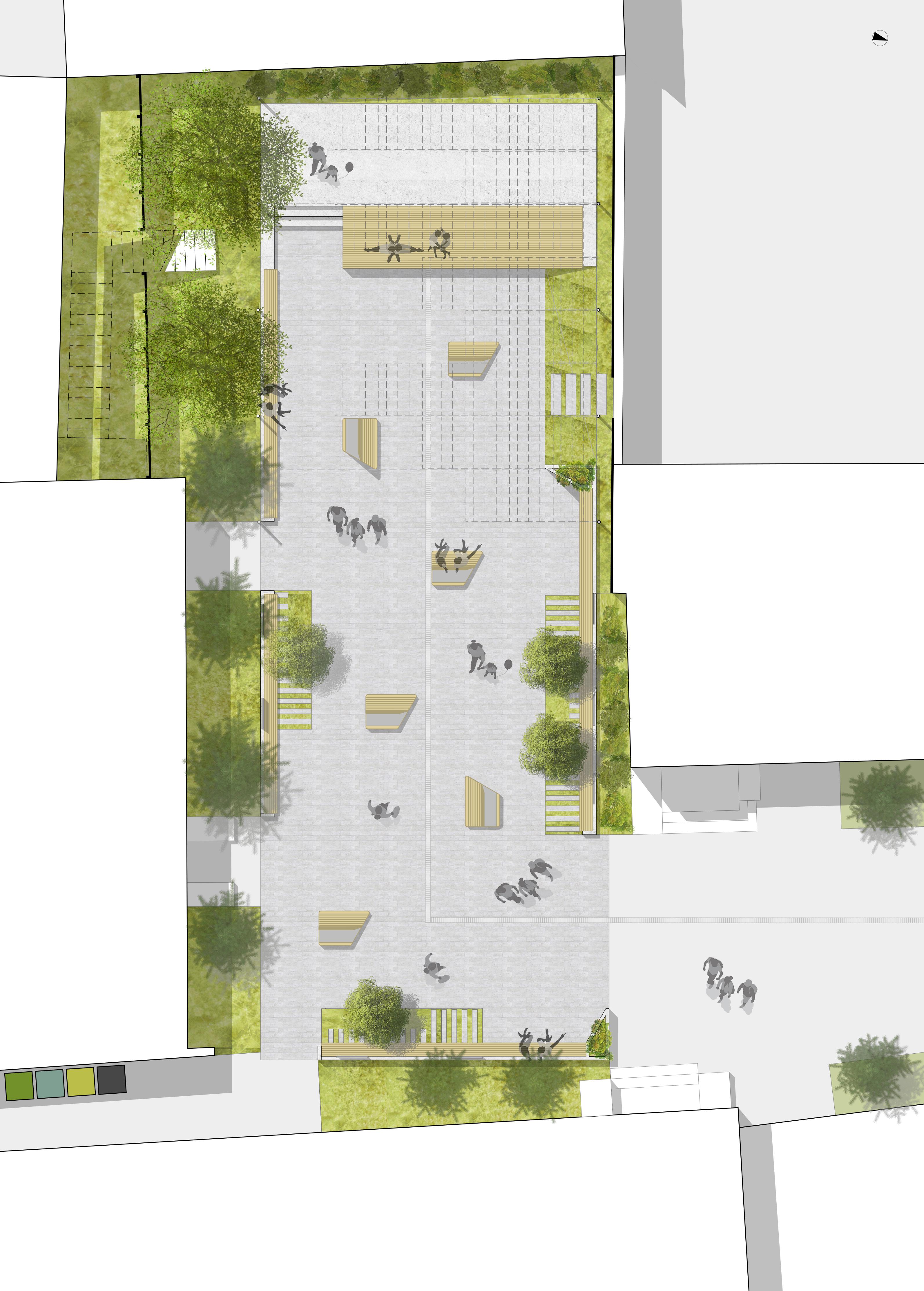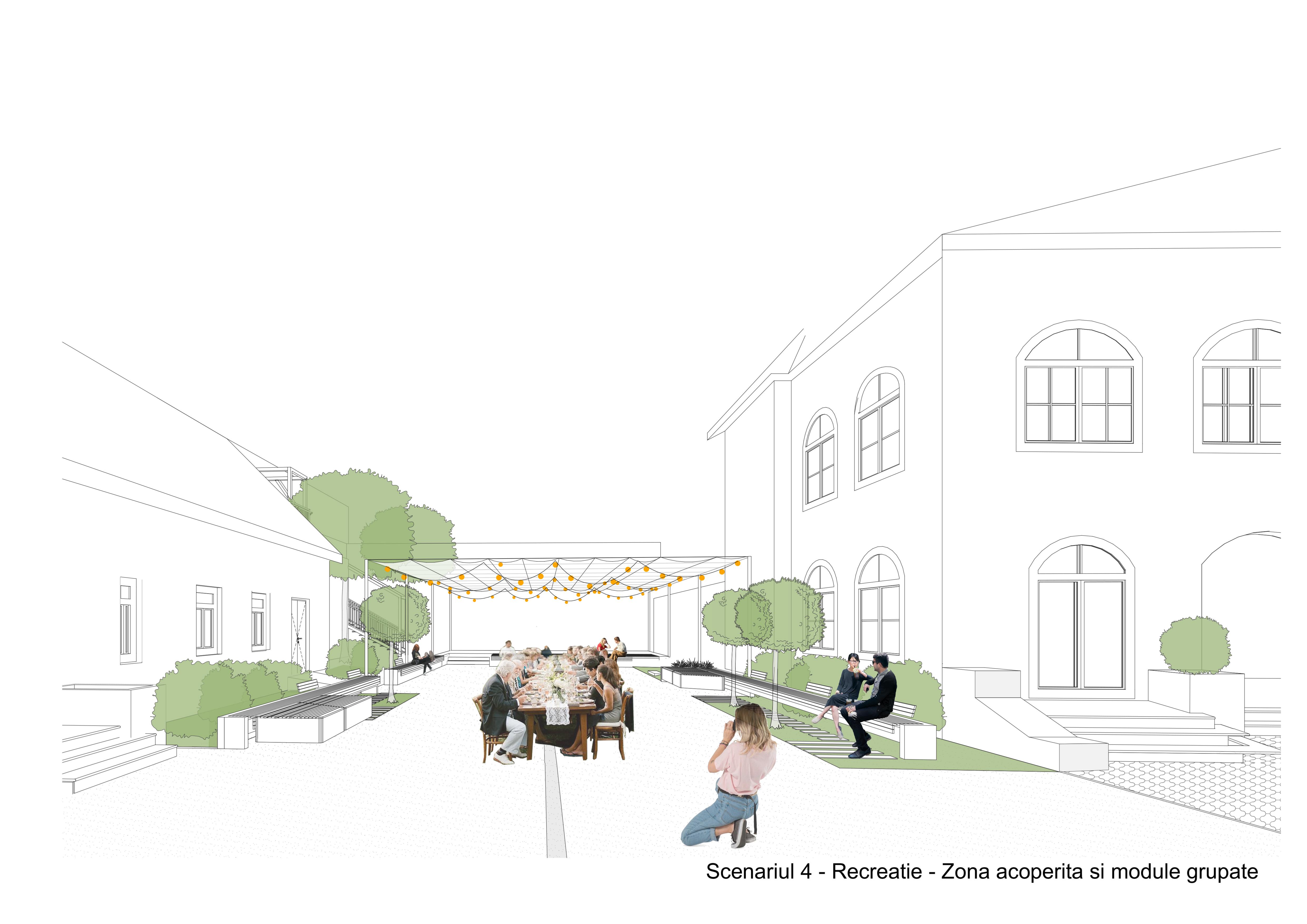 Am mers pe o soluție care ajută cât mai mult polivalența aceswtui spațiu ca design. Am conturat o curte cât mai liberă, dreptunghiulară, cu banci fixe și mobile pe contur și o zonă mai înailtă cu rol de scenă. Flexibilitatea utilizării curții e dată de modulele mobile, corpuri de bănci pe roți și de o copertina de pânză retractabilă care are rol de protecție de soare.